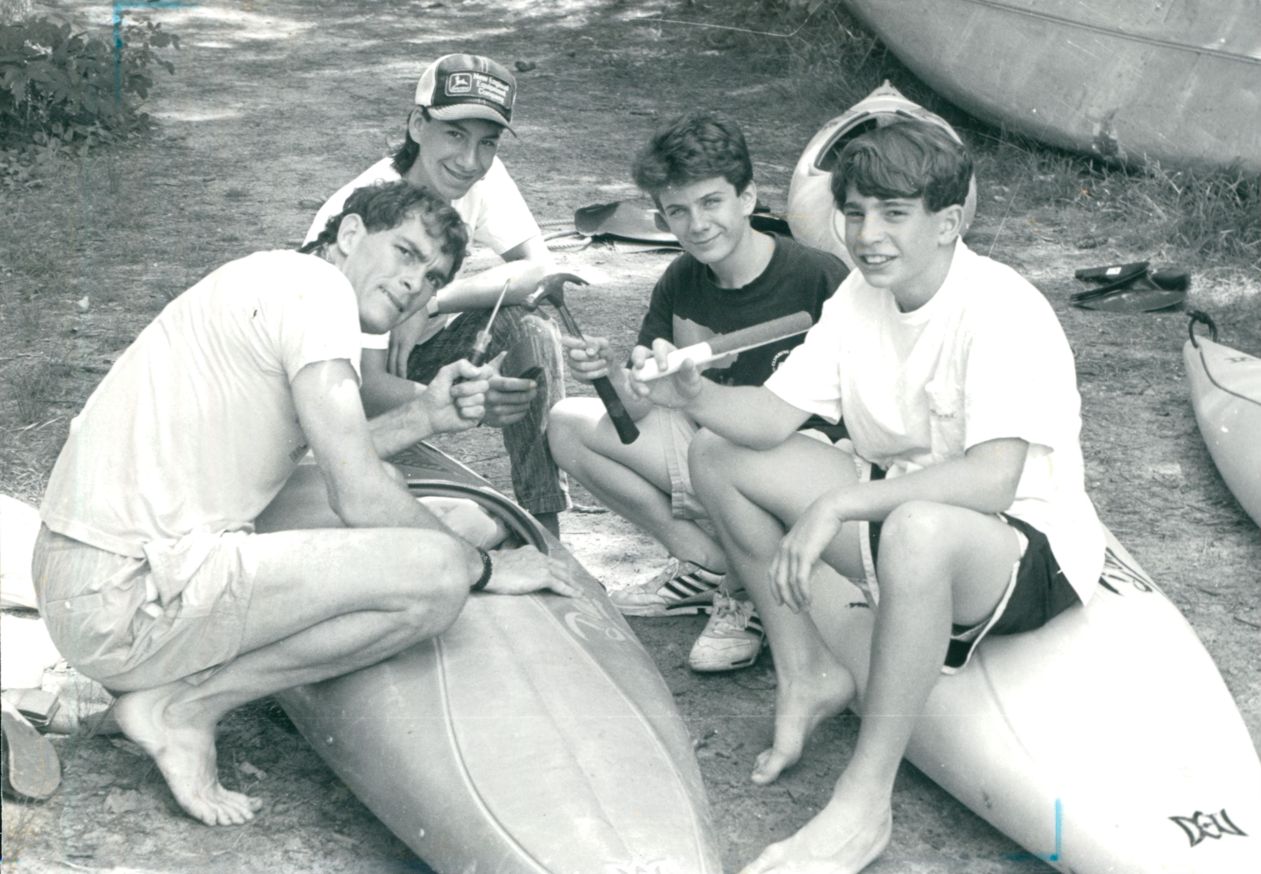 Developments in plastics also changed whitewater paddling, making rocky rivers less intimidating. Rotomolded plastic kayaks were less expensive and more durable than fiberglass or wood. When plastic kayaks first appeared in the mid-1970s, Kabeyun purchased six River Chasers. Throughout the 1980s, camp added more user-friendly kayaks, the Perception Mirages and Dancers, while shifting away from aluminum canoes, which were prone to leaking. Terry Dash, who arrived at Kabeyun in 1985, recalls gradually updating the fleet to better suit camp’s whitewater adventures: