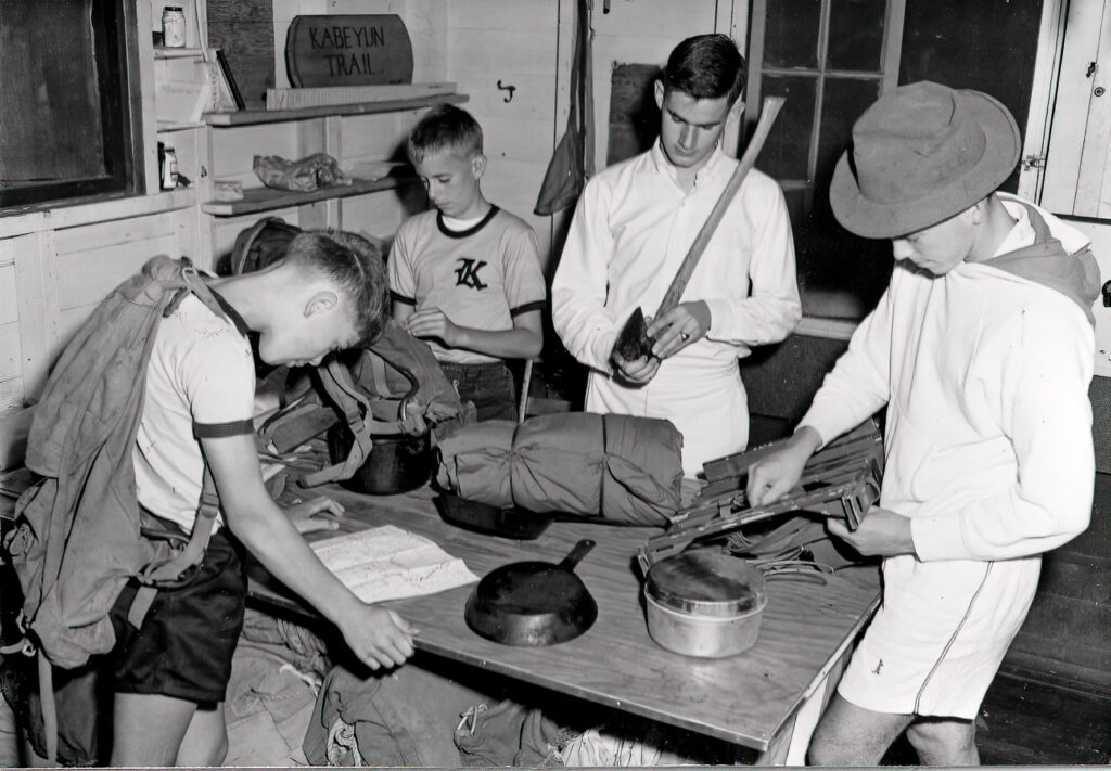 In 1953, camp built its first “trips room,” a small addition at the back of the kitchen and bakery, where counselors could store and organize equipment, maps, and more. The same year, hiking counselor Ivan Hall founded the Kabeyun Mountain Club, whose signature red bandanas endure more than 70 years later, along with the tradition of climbing Mt. Carrigain. Hall later recollected: